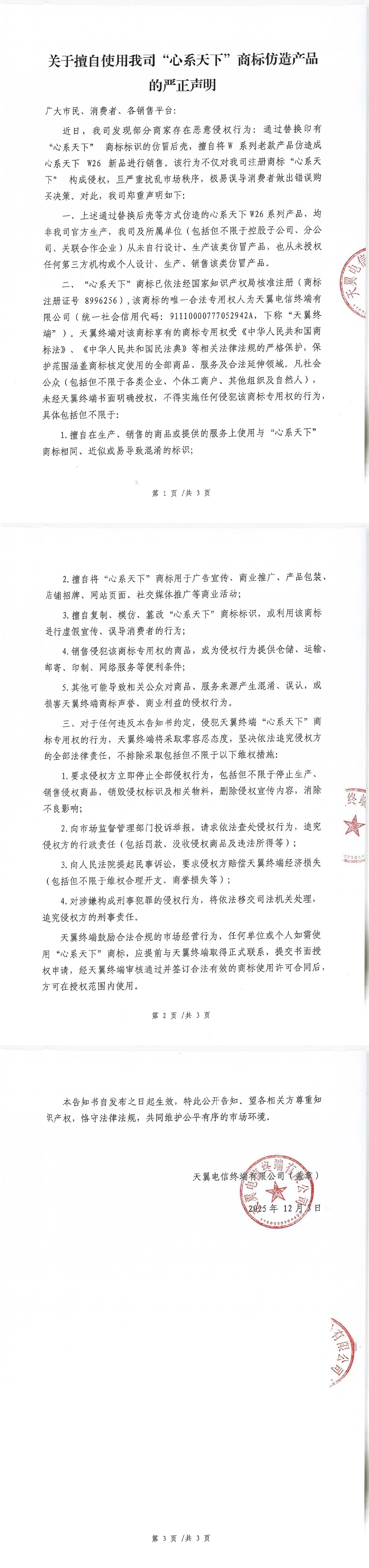 部分商家將老款產(chǎn)品仿冒心系天下 W26 新品銷售,中國電信嚴(yán)正聲明
