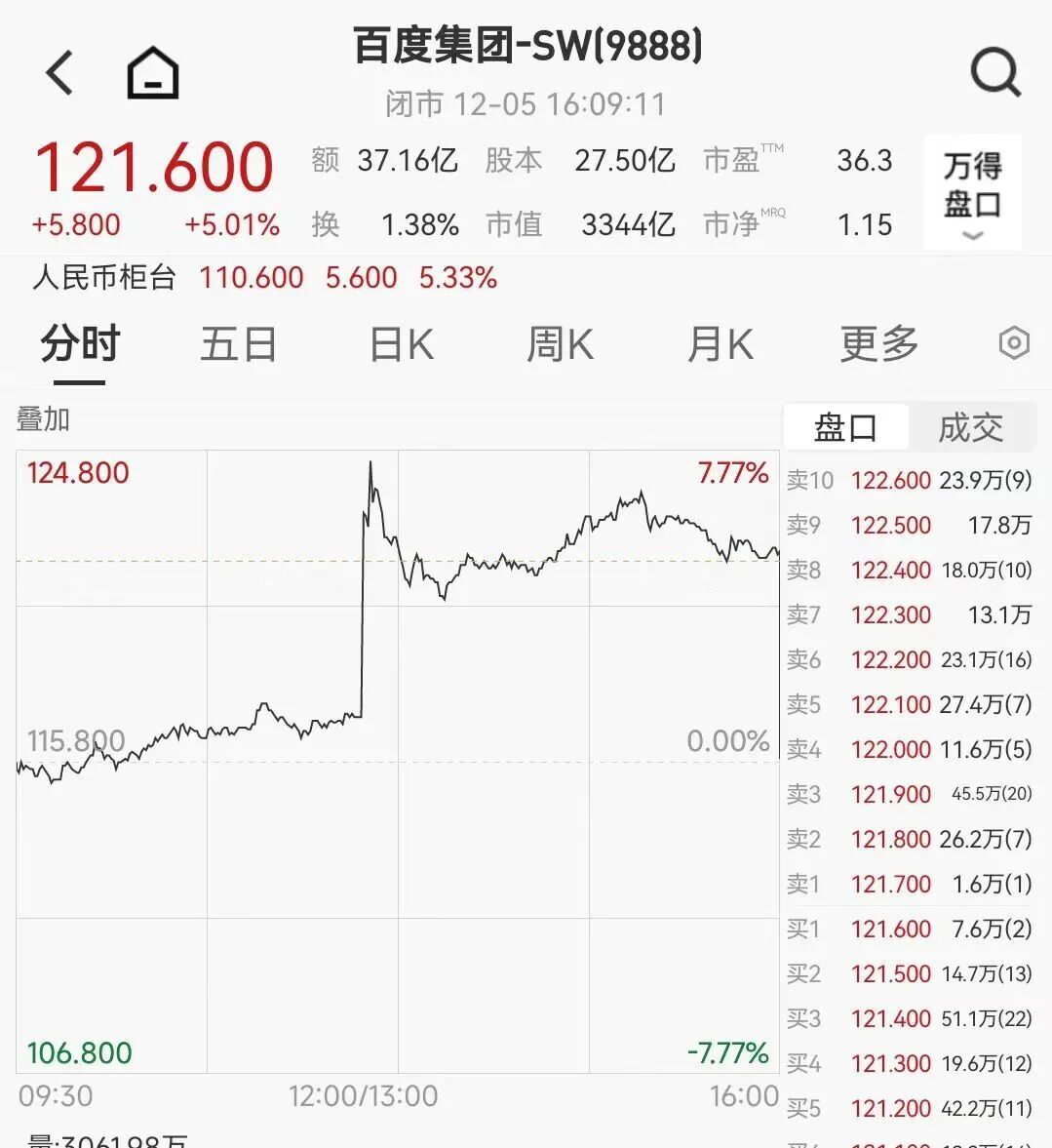 截至12月5日,百度港股午后突然直線拉漲,一度漲近8%。隨后漲幅收窄,截至收盤漲超5%,報121.6港元/股,總市值為3344億港元。