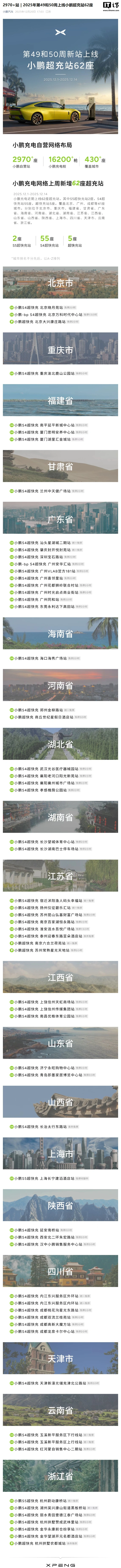 12月1日-12月14日,小鵬充電上線62座超充站,其中S5超快充站2座,S4超快充站55座,超快充站5座。覆蓋北京、廣州、成都等41座城市。