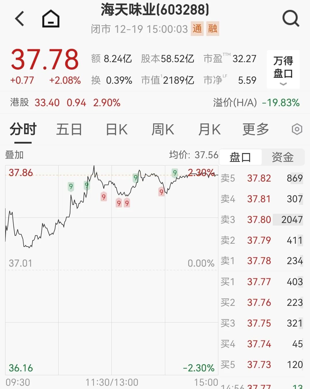 2025年以來A股市場整體走熱,但海天味業(yè)股價震蕩下行,截至12月19日A股收盤價37.78元/股,較年初的45.9元/股已跌去17.69%;同日港股收盤價33.4港元/股,較發(fā)行價(36.3港元)微跌8%。