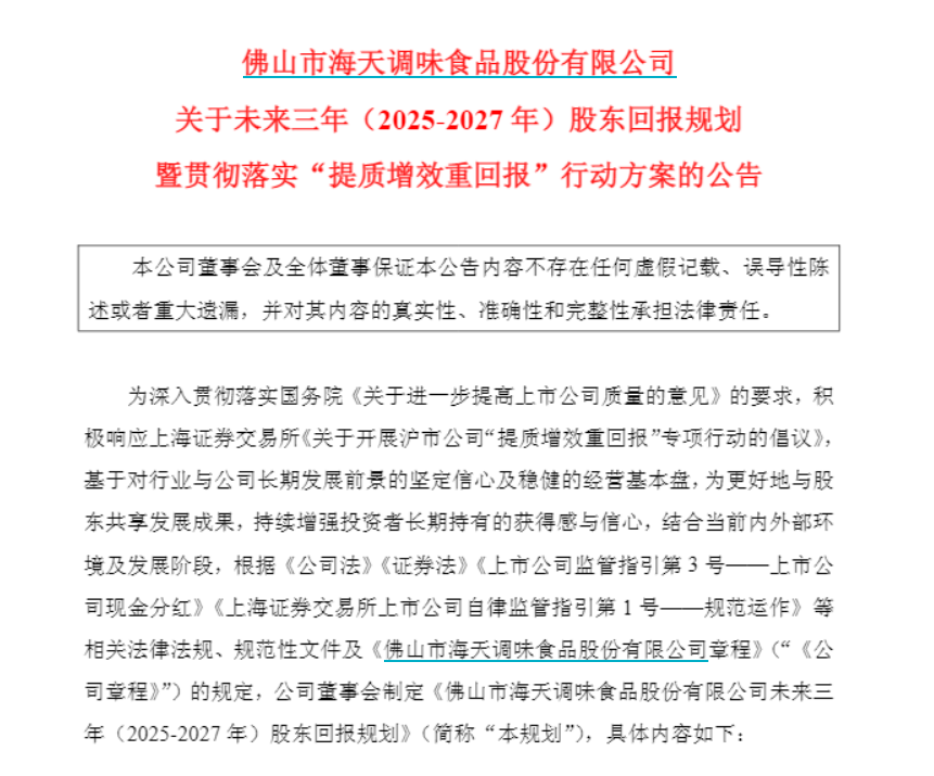 自2023年下半年監(jiān)管層持續(xù)倡導(dǎo),特別是2024年新“國九條”及其配套措施將“提質(zhì)增效重回報”納入核心框架并配套強化分紅監(jiān)管措施以來,A股上市公司整體分紅力度與頻次顯著提升。市場正從過去的重融資,向融資與回報并重的良性生態(tài)演進。在此背景下,海天味業(yè)的超高比例承諾,或許預(yù)示著上市公司回報股東的新常態(tài)正在加速形成。
