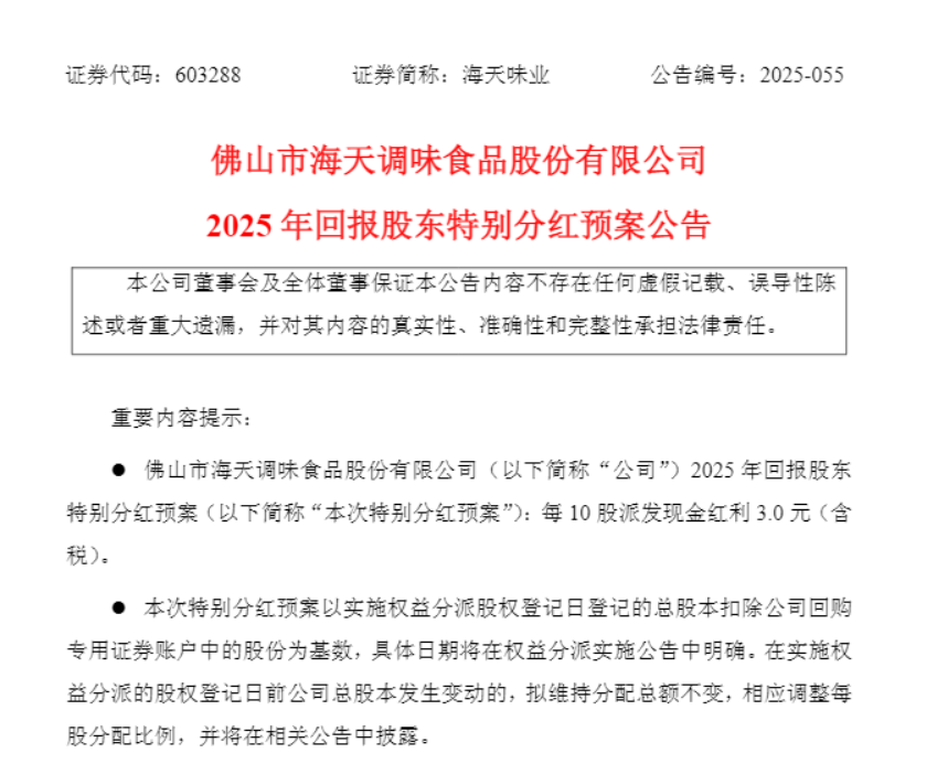 承諾的背后,是實實在在的現(xiàn)金回報。海天味業(yè)同時公告了一項總額超17.54億元的股東特別分紅,以慶祝公司重要里程碑。加之其在2025年首次實施的中報分紅15.19億元,年內(nèi)累計分紅達32.73億元,規(guī)模已十分可觀。