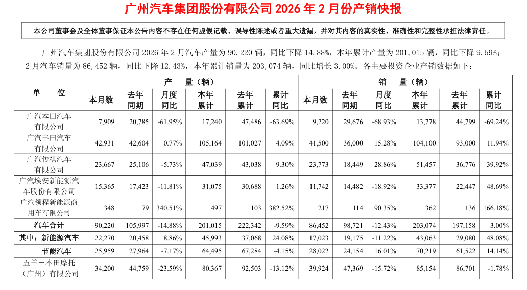 3月2日,廣汽集團(tuán)(601238)(601238.SH)發(fā)布2026年2月份產(chǎn)銷快報(bào)。數(shù)據(jù)顯示,公司2月汽車產(chǎn)量為90,220輛,同比下降14.88%,本年累計(jì)產(chǎn)量為201,015輛,同比下降9.59%;2月汽車銷量為86,452輛,同比下降12.43%,本年累計(jì)銷量為203,074輛,同比增長3.00%。