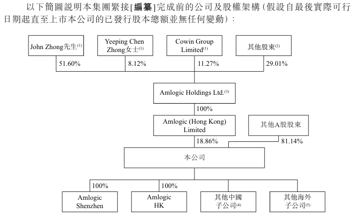 截至最后實(shí)際可行日期(2026年4月7日),晶晨半導(dǎo)體(881121)(香港)有限公司由AmlogicHoldingsLtd.全資擁有。AmlogicHoldingsLtd.由(i)JohnZhong先生,(ii)YeepingChenZhong女士(即JohnZhong先生的配偶),及(iii)CowinGroupLimited(由陳海濤先生(YeepingChenZhong女士的父親)全資擁有)分別擁有51.60%、8.12%及11.27%的權(quán)益。根據(jù)中國(guó)法律及法規(guī)的規(guī)定,JohnZhong先生、YeepingChenZhong女士及陳海濤先生均被視為一致行動(dòng)人士,故被視為于彼此所持有的股份中擁有權(quán)益。因此,根據(jù)證券及期貨條例,AmlogicHoldingsLtd.、JohnZhong先生、YeepingChenZhong女士及陳海濤先生被視為于Amlogic(HongKong)Limited所持股份中擁有權(quán)益。