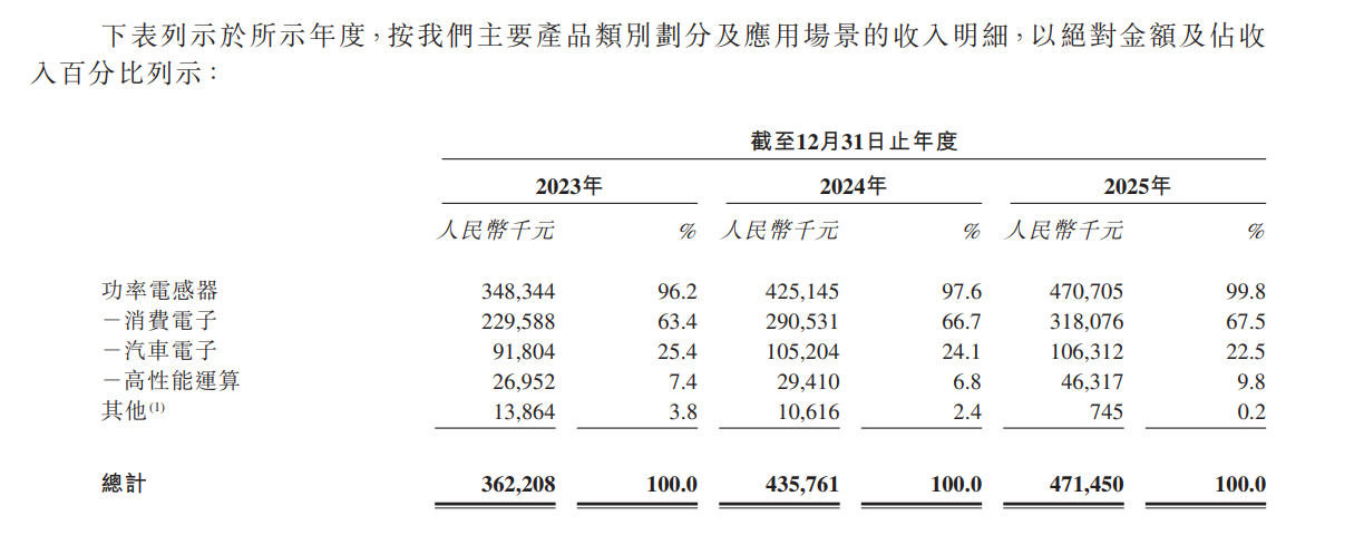 在2025年中,瑪冀電子的功率電感器來自消費(fèi)電子(881124)、汽車電子(885545)、高性能運(yùn)算的收入占比分別為67.5%、22.5%、9.8%。顯然,消費(fèi)電子(881124)仍然是瑪冀電子的核心領(lǐng)域,來自高性能運(yùn)算場景的收入占比仍不高。