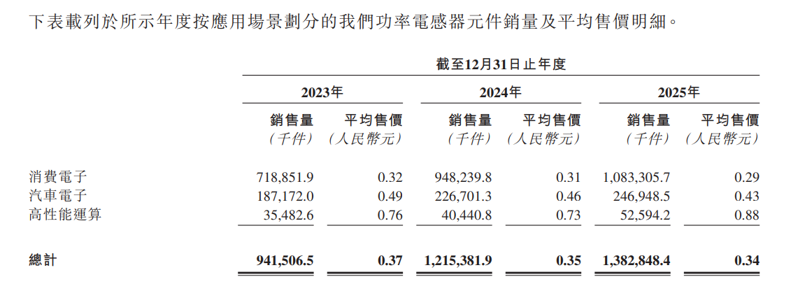 值得注意的是,瑪冀電子三大應(yīng)用場景的營收增長邏輯存在顯著差異。消費(fèi)電子(881124)與汽車電子(885545)領(lǐng)域呈現(xiàn)出 “量增價(jià)跌” 的特征,即收入增長主要依靠銷量驅(qū)動(dòng),而產(chǎn)品平均售價(jià)在市場競爭加劇的背景下持續(xù)走低。與之形成對(duì)比的是,高性能計(jì)算場景則實(shí)現(xiàn)了“量價(jià)齊升”,其產(chǎn)品平均售價(jià)從2023年的0.76元增至2025年的0.88元,同期銷量也從3548.26萬件增長至5259.42萬件。