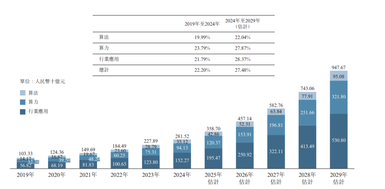 中國(guó)AI技術(shù)解決方案市場(chǎng)正在經(jīng)歷一輪高確定性的擴(kuò)容。根據(jù)弗若斯特沙利文資料,中國(guó)AI技術(shù)解決方案市場(chǎng)規(guī)模2029年將進(jìn)一步增至9,477億元,2024—2029年復(fù)合增速達(dá)27.5%。這一增長(zhǎng)并非單純來(lái)自底層算力投入,而是算法、算力與行業(yè)應(yīng)用三端同步放量,意味著AI正在從技術(shù)能力建設(shè),逐步走向真實(shí)商業(yè)場(chǎng)景的大規(guī)模落地。