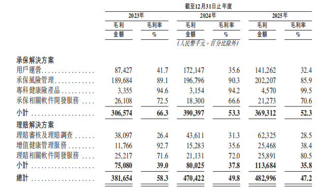 根據(jù)智通財(cái)經(jīng)APP觀(guān)察,這種“增收不增利”的結(jié)構(gòu)性背離,根源在于收入支柱——承保解決方案的盈利質(zhì)量加速惡化。承保業(yè)務(wù)占總收入比重近七成,但其板塊毛利率從66.3%暴跌至52.3%,三年降幅達(dá)14個(gè)百分點(diǎn)。細(xì)分來(lái)看,用戶(hù)運(yùn)營(yíng)業(yè)務(wù)(占承保收入超六成)毛利率從41.7%降至32.4%,且毛利額已出現(xiàn)絕對(duì)下降——2025年該業(yè)務(wù)毛利1.41億元,較2024年的1.72億元減少18.0%,而同期收入僅下降8.8%,表明盈利能力的惡化速度遠(yuǎn)超收入收縮速度。高毛利的承保風(fēng)險(xiǎn)管理業(yè)務(wù)雖毛利率仍維持在85%以上,但收入增長(zhǎng)近乎停滯(2025年同比僅增8.0%,此前一年增速僅2.3%),無(wú)力對(duì)沖用戶(hù)運(yùn)營(yíng)業(yè)務(wù)的盈利塌陷。