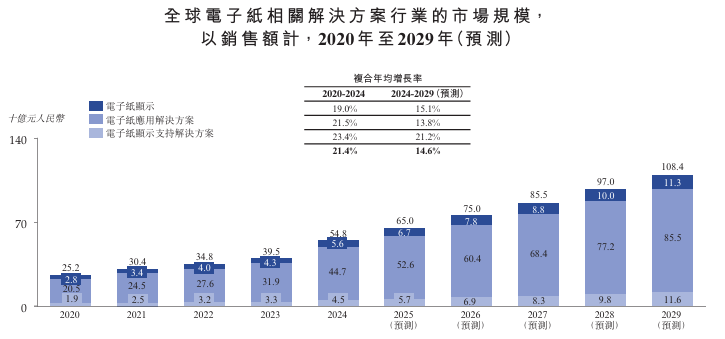 在此背景下,全球零售業(yè)加速數(shù)字化轉(zhuǎn)型,電子價簽普及率穩(wěn)步提升。根據(jù)灼識咨詢,預(yù)計2029年全球電子紙(885953)顯示器市場在智慧零售領(lǐng)域?qū)⑦_到5.55億片,2024年至2029年的復合年均增長率為15.6%;同時,智慧教育、智慧辦公、智慧物流(SLGB)等新興領(lǐng)域快速發(fā)展,電子紙(885953)在智能運輸、智能家居(885478)交互屏等場景的應(yīng)用日益增多,進一步推動了市場需求的提升。根據(jù)灼識咨詢,全球電子紙(885953)顯示產(chǎn)品的市場規(guī)模預(yù)計將按14.6%的復合年均增長率,從2024年的人民幣548億元增至2029年的人民幣1,084億元。