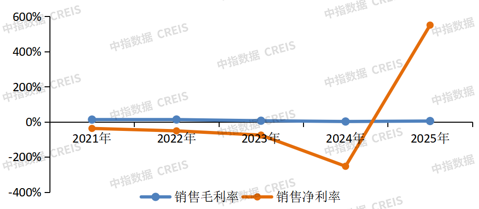 從盈利能力來看,各業(yè)務(wù)板塊表現(xiàn)分化。房地產(chǎn)(881153)開發(fā)業(yè)務(wù)的毛利率從2021年的12.56%下滑至2024年的1.23%,2025年回升至4.76%,主要得益于部分低成本項(xiàng)目的結(jié)算,但整體仍處于極低水平。物業(yè)服務(wù)、物業(yè)投資等經(jīng)營(yíng)性業(yè)務(wù)的毛利率相對(duì)較高且穩(wěn)定,成為公司毛利的重要來源。然而,由于開發(fā)業(yè)務(wù)規(guī)模龐大且虧損嚴(yán)重,經(jīng)營(yíng)性業(yè)務(wù)的盈利無法彌補(bǔ)開發(fā)業(yè)務(wù)的虧損,導(dǎo)致公司主營(yíng)業(yè)務(wù)整體虧損。