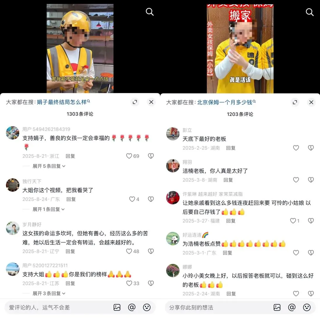 其中,一個(gè)名為“娟子”的賬號,自去年 7 月起發(fā)布“連續(xù)劇式”情節(jié),包括“尋找 20 多年未見的女兒竟然懷孕的外賣員”和“丈夫見義勇為犧牲,妻子懷孕送外賣維持生計(jì)”等。另一個(gè)名為“香港浩南”的賬號,則自去年 1 月開始,打造“香港彭氏集團(tuán)老板”的人設(shè),視頻情節(jié)多為“除夕前夜外賣女孩無家可歸”、“帶 20 歲外賣女孩回家做保姆”、“老板愛上保姆”等。