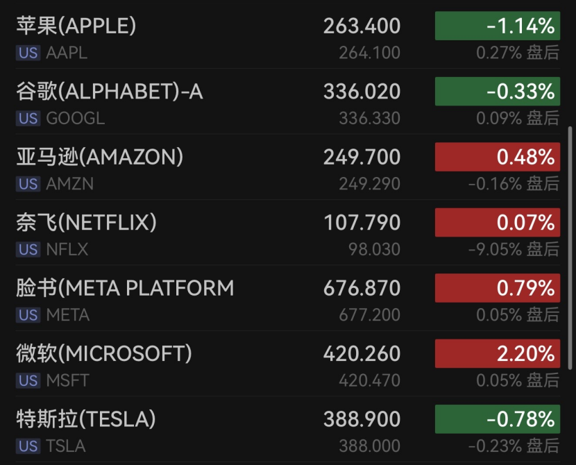 大型科技股漲跌互現(xiàn),微軟(MSFT)漲超2%,臉書漲0.79%,亞馬遜(AMZN)漲0.48%;蘋果(AAPL)跌超1%,谷歌(GOOG)跌0.33%,特斯拉(TSLA)跌0.78%,英偉達(NVDA)跌0.26%。